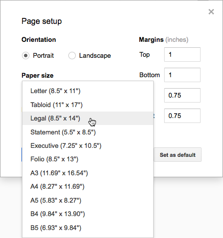 When you first create a Google document, you may want to change page setup options like page orientation, margins, or paper size, depending on the type of document you are creating. You can access these options by clicking Page setup in the File menu.